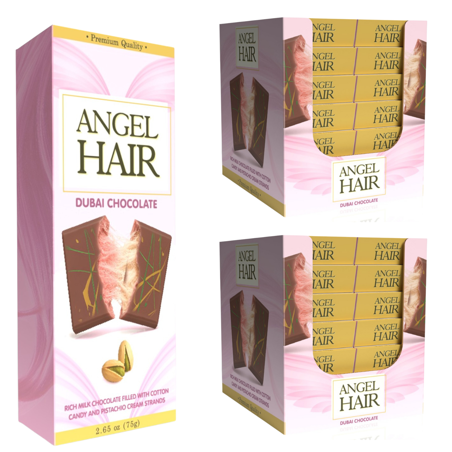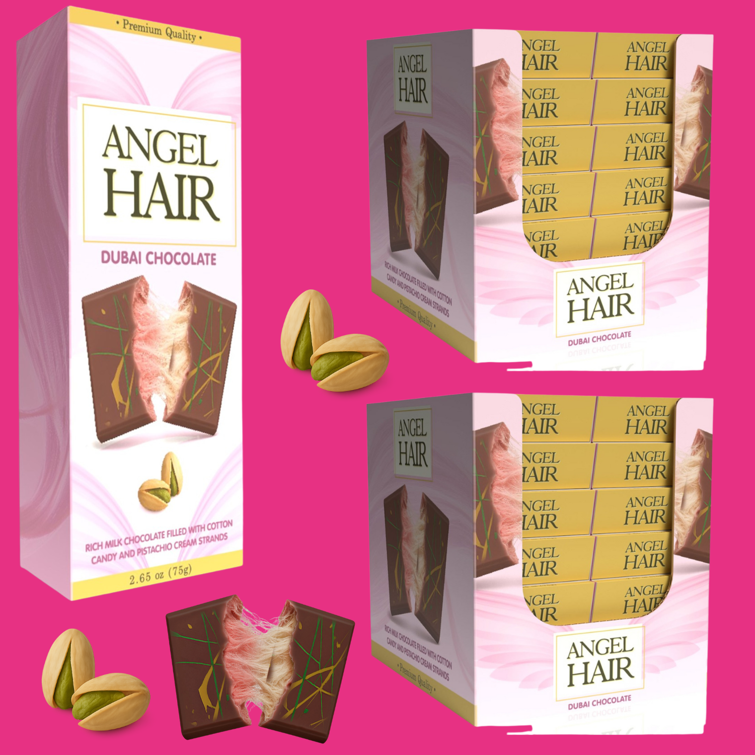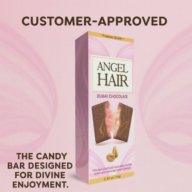 Turn your shelves into a customer magnet with the Angel Hair Pink Chocolate Bar — a premium 2.65 oz indulgence crafted with silky milk chocolate, airy cotton candy strands, and rich pistachio cream. This unique layering creates a soft, fluffy angel hair texture that melts in the mouth and leaves customers delighted with every bite.