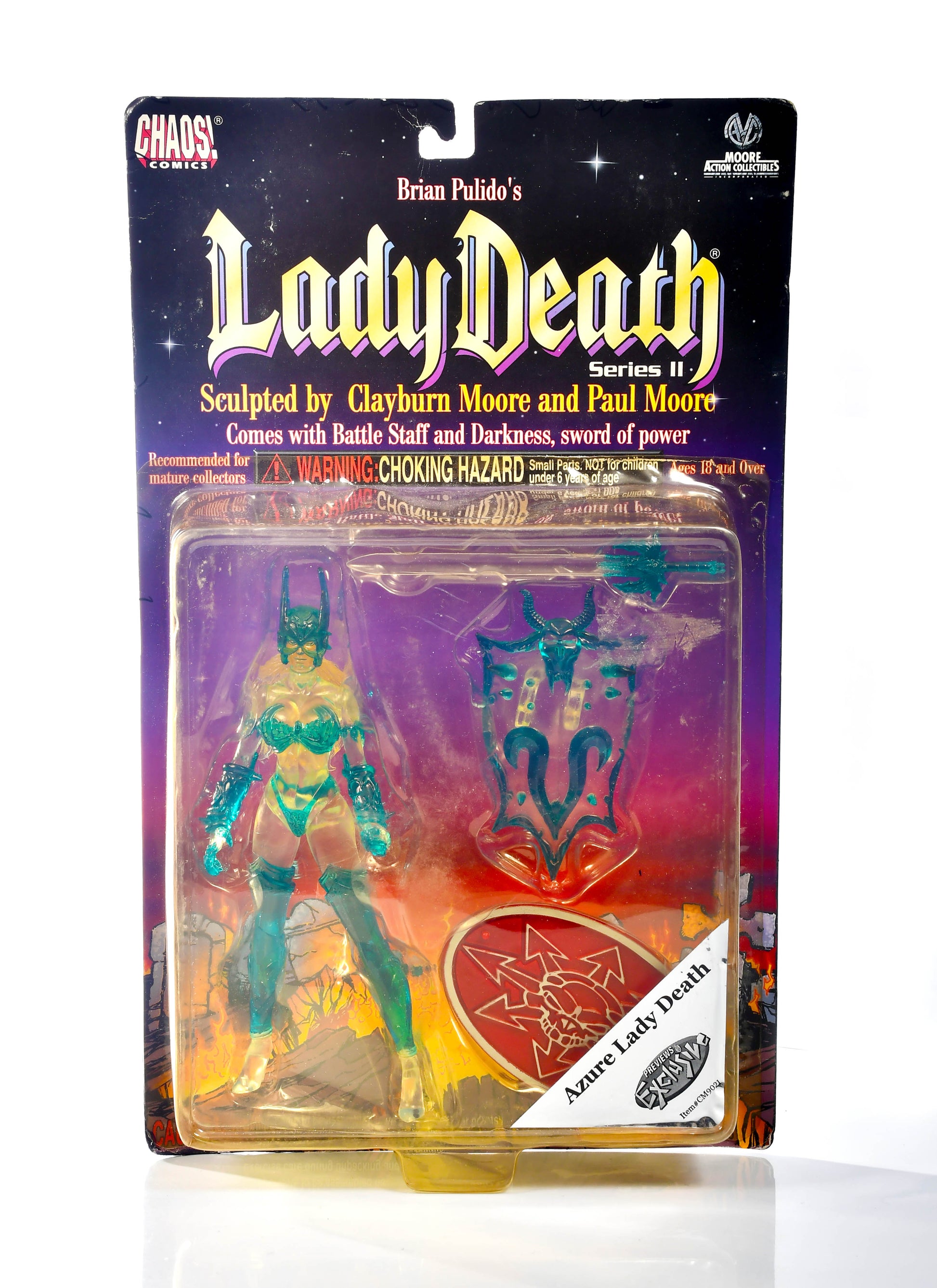 The Brian Pulido's Azure Lady Death Series 2 Previews Exclusive Action Figure is a rare collector's item from 1999, produced by Moore Action Collectibles. This action figure features the character Lady Death from the Chaos Comics franchise, making it a valuable addition to any action figure collection. With its original design and exclusive features, this toy captures the essence of the dark and edgy world of Lady Death, perfect for fans of the series.