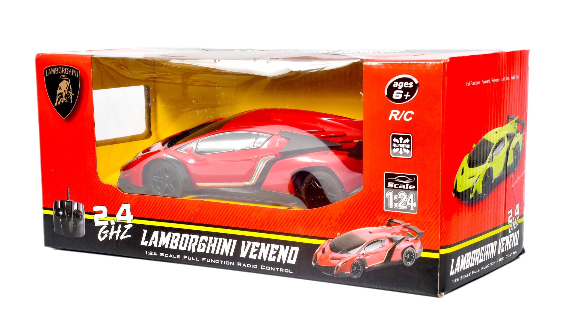 The 1:24 Scale Full Function Radio Control Red Lamborghini Veneno Model Car is a plastic model car designed for children aged 8-11 years. This toy-grade model features the iconic Lamborghini brand and is ready to go out of the box, with all necessary components included for easy operation. With a brushed motor type and 2WD capability, this electric-powered car is perfect for on-road racing and provides a fun and exciting experience for young enthusiasts of scale model vehicles.