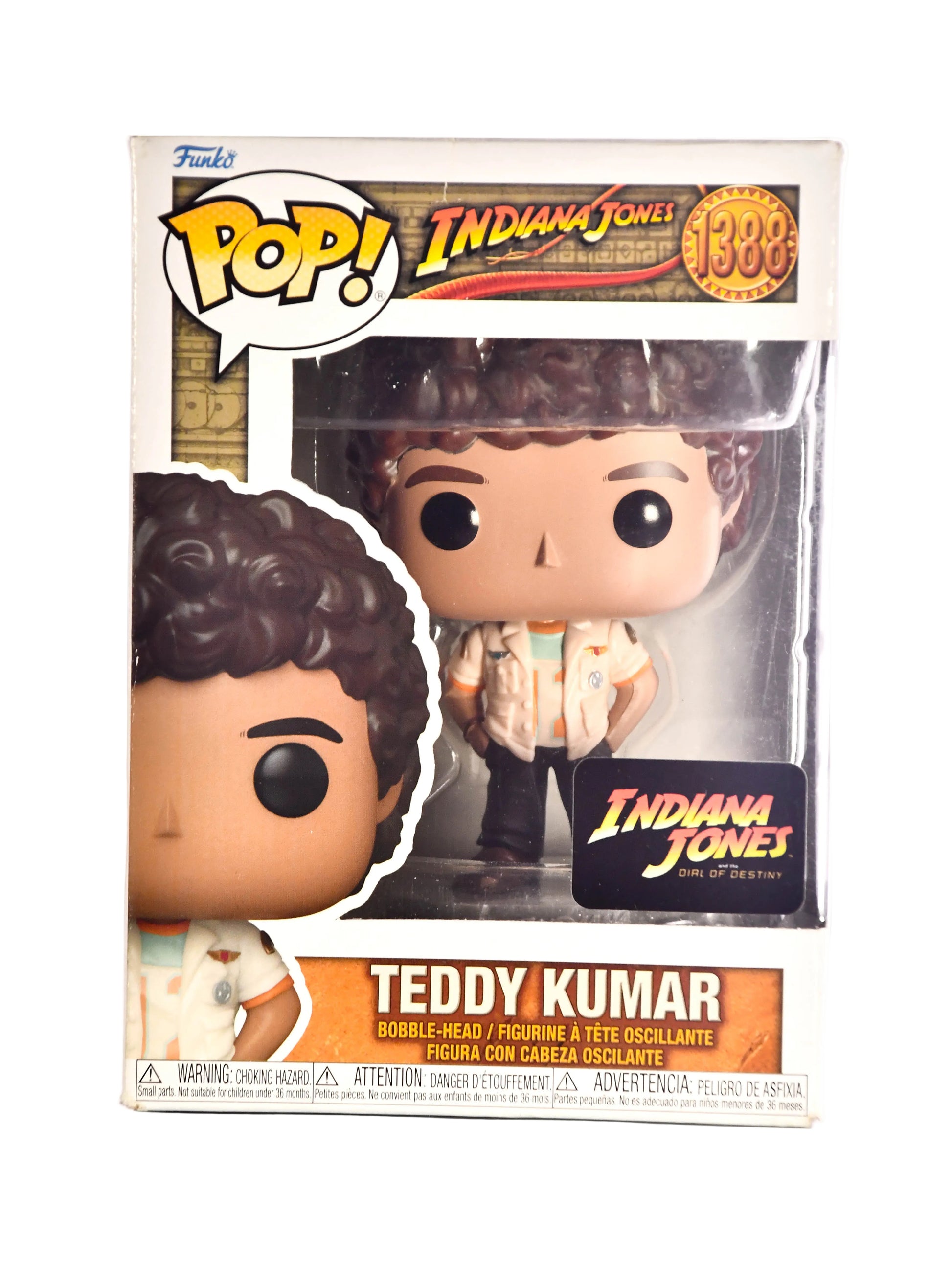 The Funko POP! Disney: Indiana Jones - Teddy Kumar #1388 is a collectible figure from the Indiana Jones franchise. This Pop! Vinyl features a character from the movie "Indiana Jones and the Dial of Destiny" and is part of series 1 for Indiana Jones 5. Made of vinyl, this collectible comes in a vaulted box labeled with the box number 1388. Perfect for fans of the Indiana Jones series, this Funko POP! figure captures a unique moment from the iconic franchise.