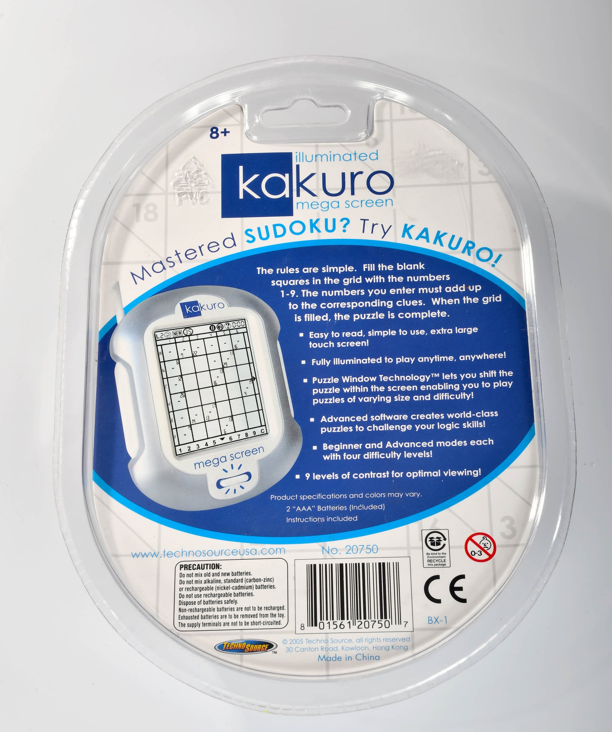 The Kakuro Illuminated Mega Touch Screen Logic Puzzle Techno Source Travel Game is a handheld electronic game designed for puzzle enthusiasts. Developed by Technosource in 2005, this game features the popular Kakuro puzzle title and is recommended for ages 8 and up. With a sleek touch screen interface and illuminated gameplay, this travel game provides hours of entertainment for players of all ages. Perfect for Sudoku fans and logic puzzle enthusiasts, this game is a great way to pass the time and challenge the mind on-the-go.
