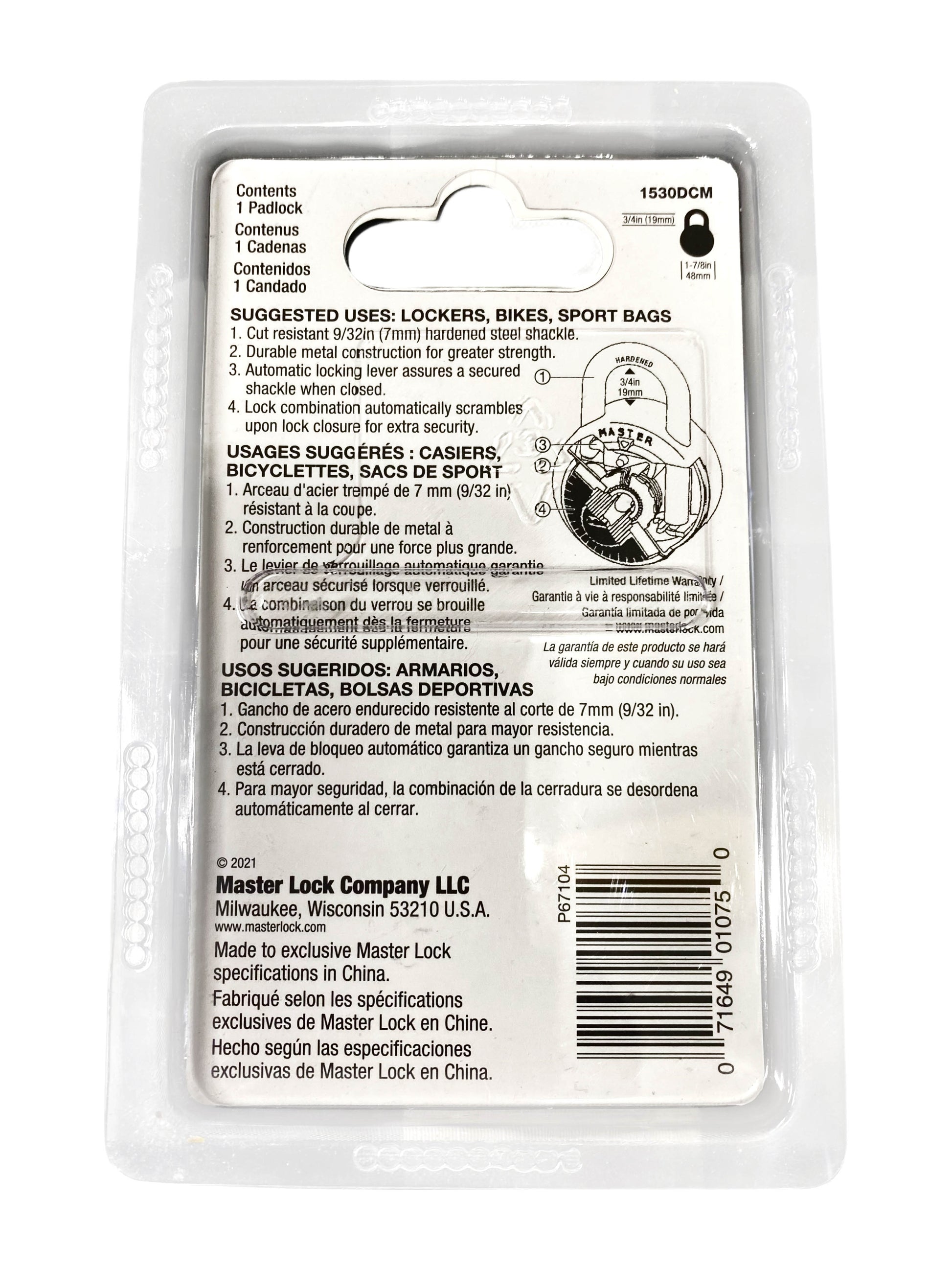 The Master Lock Combination Padlock is a reliable and secure option for locking your belongings. With its vibrant colors of red, purple, or blue, it is easy to identify and suit your personal style. Made by the trusted brand Master Lock and manufactured in China, this locker lock is ideal for use in schools, bikes, or any other personal property. The model 1530DCM offers durability and peace of mind for your belongings.