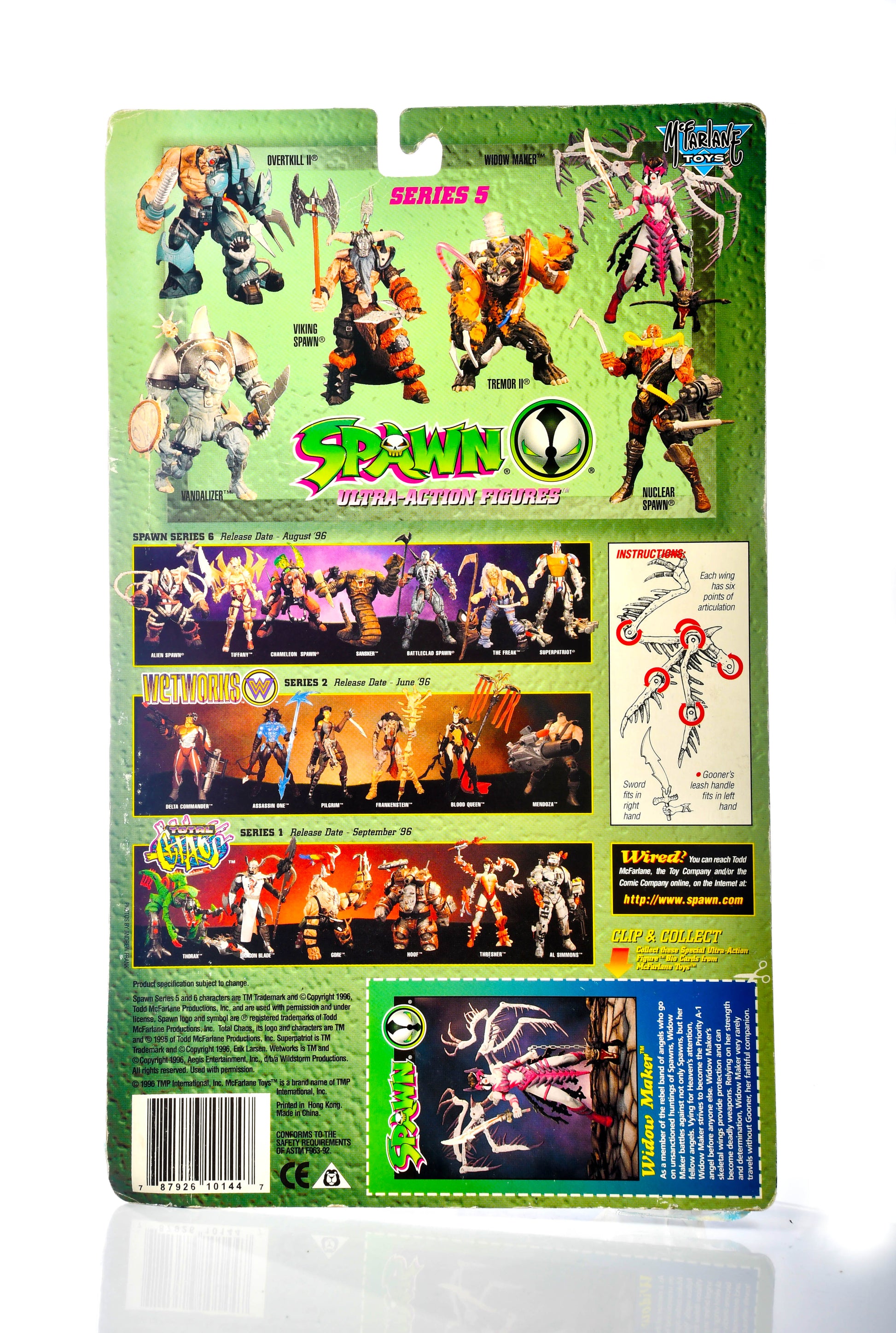 The McFarlane Toys Spawn Widow Maker Action Figure in Red Black White Variant from Series 5 is a vintage collectible from the Spawn franchise. This 6-inch tall plastic figure of the character Widowmaker, manufactured in 1996, is an original licensed reproduction from 20th Century Animation. The action figure comes in its original unopened packaging, adding to its value as a sought-after item for collectors and fans of the Spawn series. The detailed design and iconic look of the Widowmaker make it a standout piece for any action figure enthusiast. (OPEN BOX)