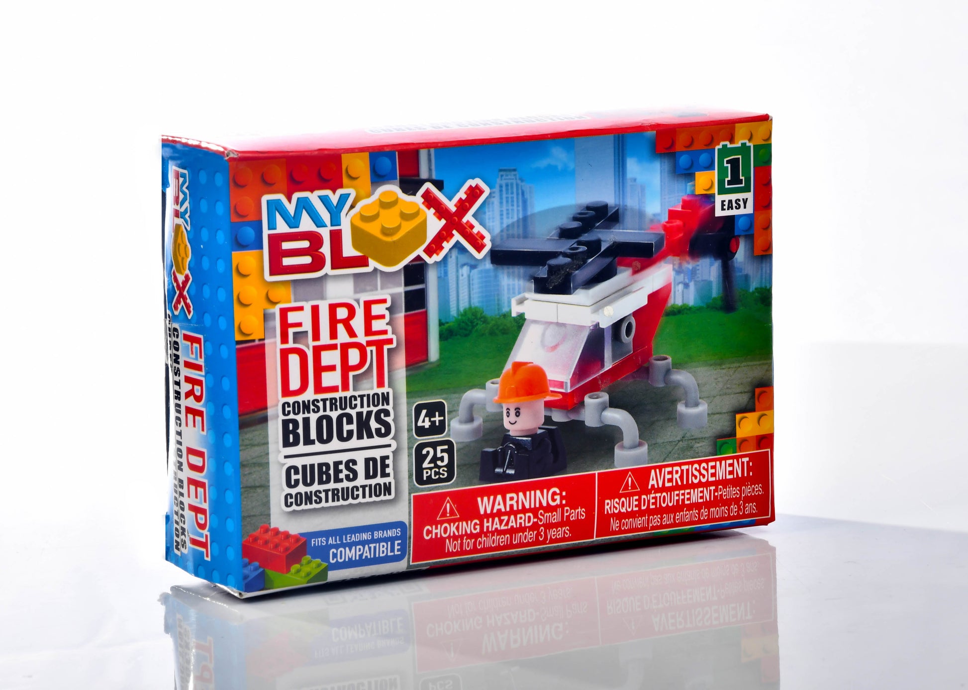 The My Blox Building Fire Dept. Helicopter is a 5-piece toy gift made of plastic, featuring a colorful design with a fireman, hero, and firefighter theme. This construction block set, manufactured in 2018, is suitable for children aged 4 and up and is compatible with leading brands. The set includes all the necessary pieces to build a fire department helicopter, perfect for imaginative play and storytelling adventures.