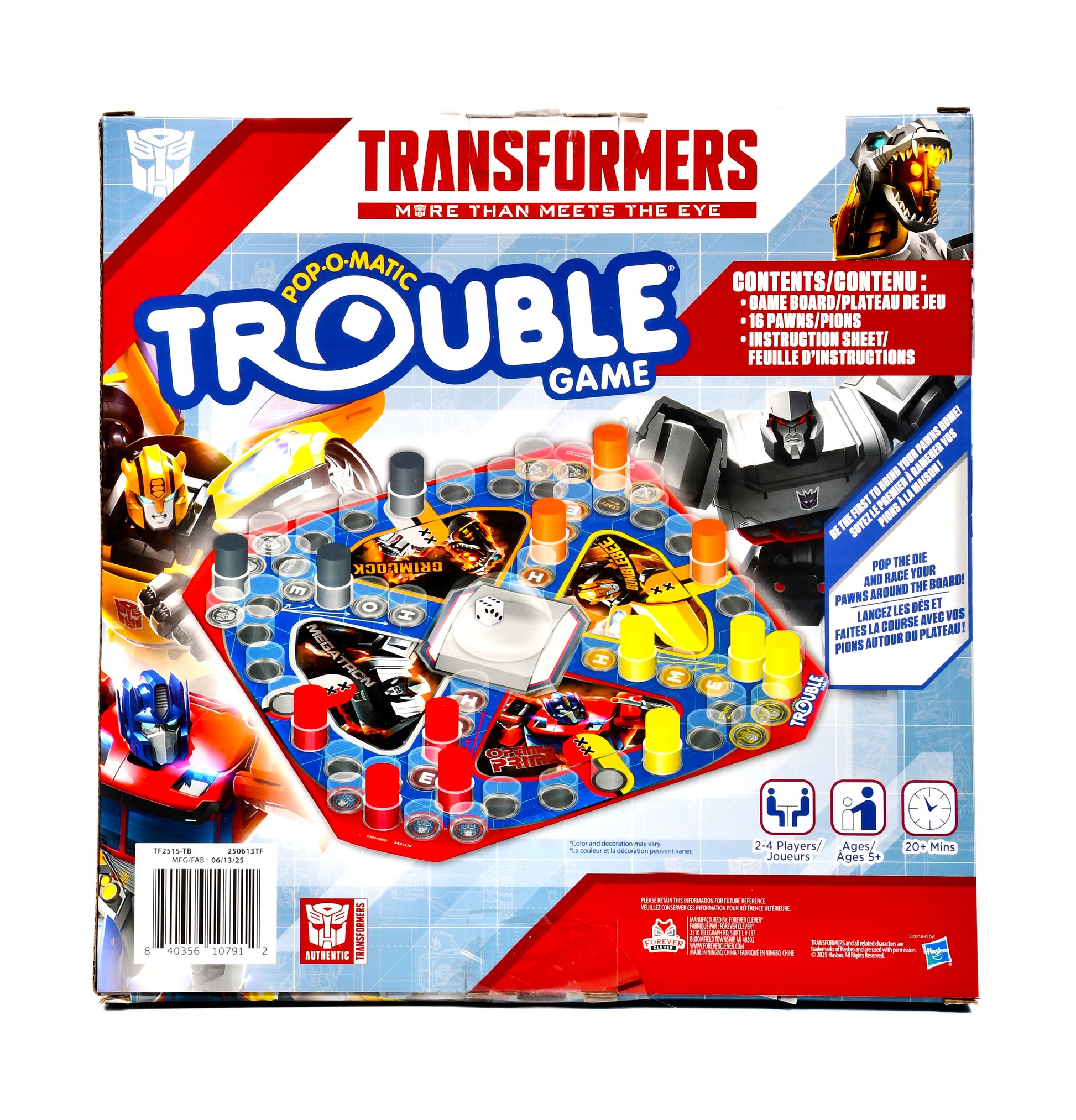 The Transformers Trouble Game by Hasbro is a family game featuring the popular Transformers franchise. Players can enjoy a fun and interactive experience with their favorite Transformers characters as they try to outwit their opponents and collect points. This competitive game is sure to provide hours of entertainment for players of all ages.