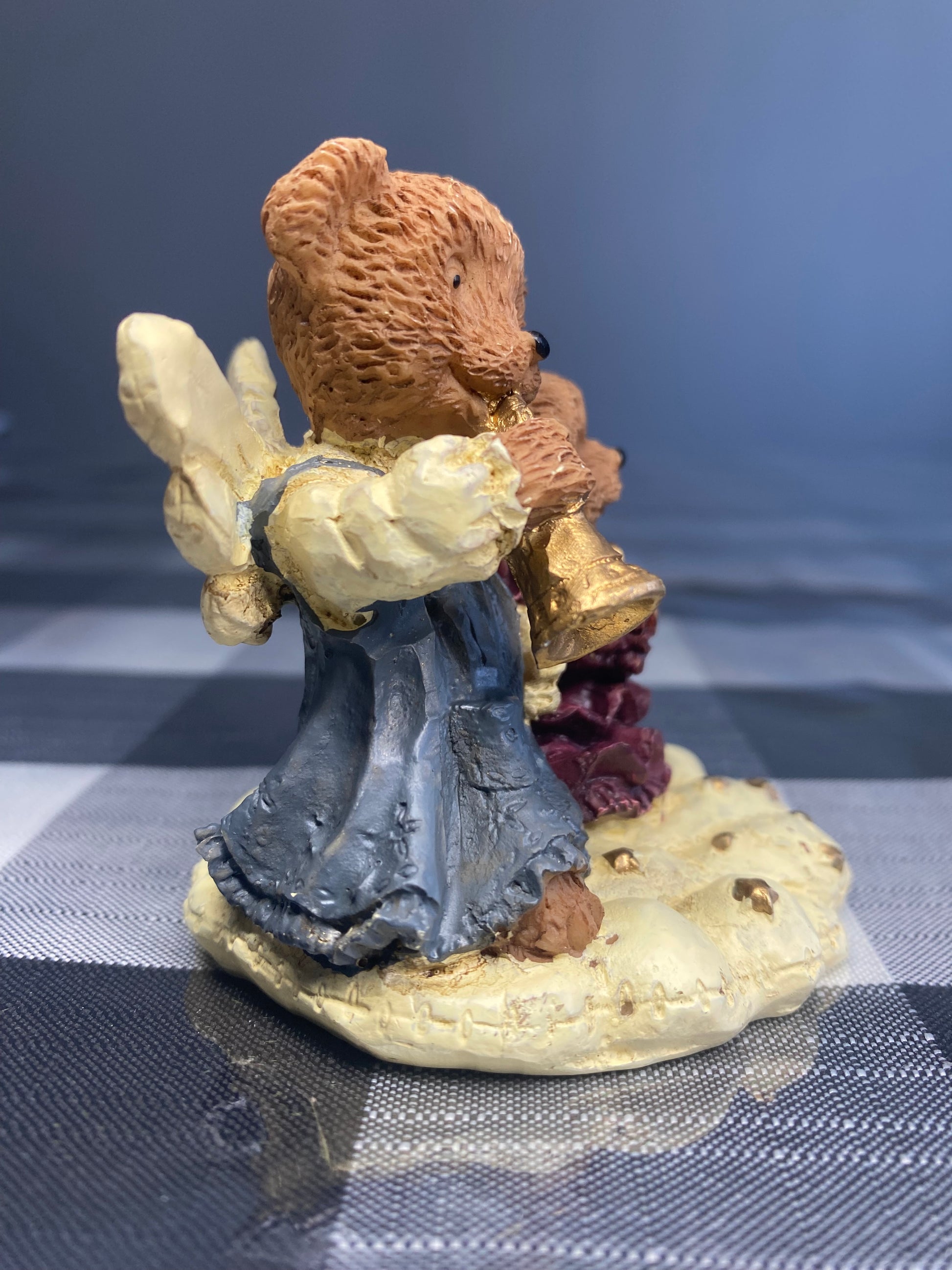 The product is a pair of ceramic figurines depicting two teddy bears angels who are musicians. These charming collectibles are beautifully crafted and make for delightful additions to any home decor. Perfect for bear enthusiasts and collectors alike, these figurines are sure to bring joy and whimsy to any room.